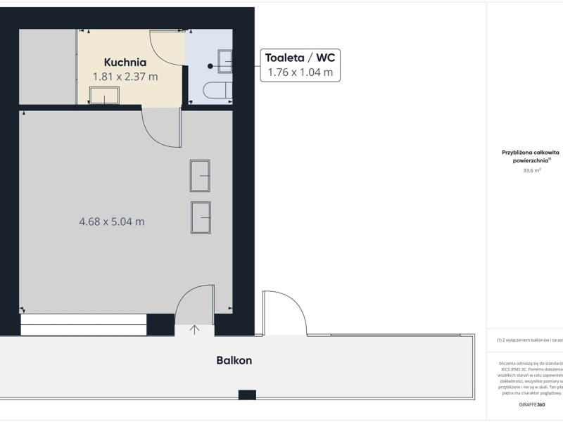 33,6 m² – powierzchnia użytkowa (do całkowitej wliczone jest dojście do lokali poprzez galerię)
